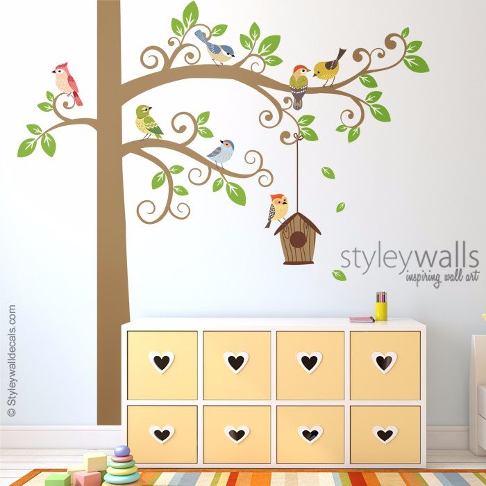 מדבקת קיר לחדר ילדים עץ מתפתל וציפורים