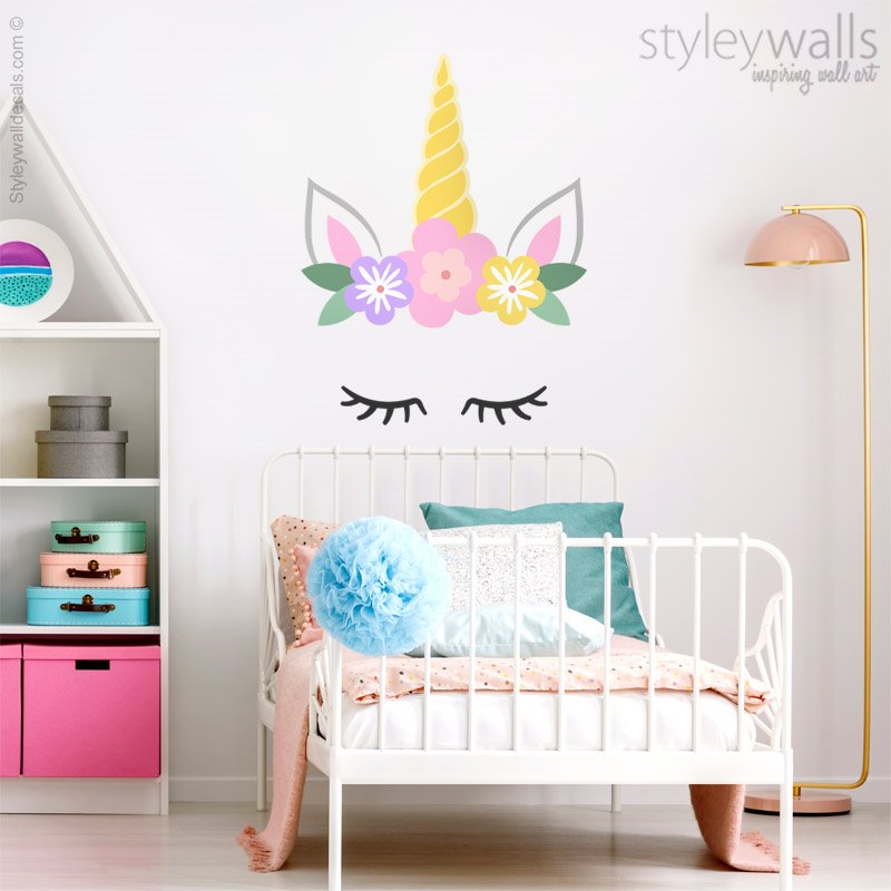 מדבקת קיר לחדרי ילדים חד קרן עם פרחים לחדרי בנות