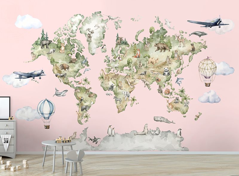 טפט לחדרי ילדים מפת עולם עם חיות- צבעי מים