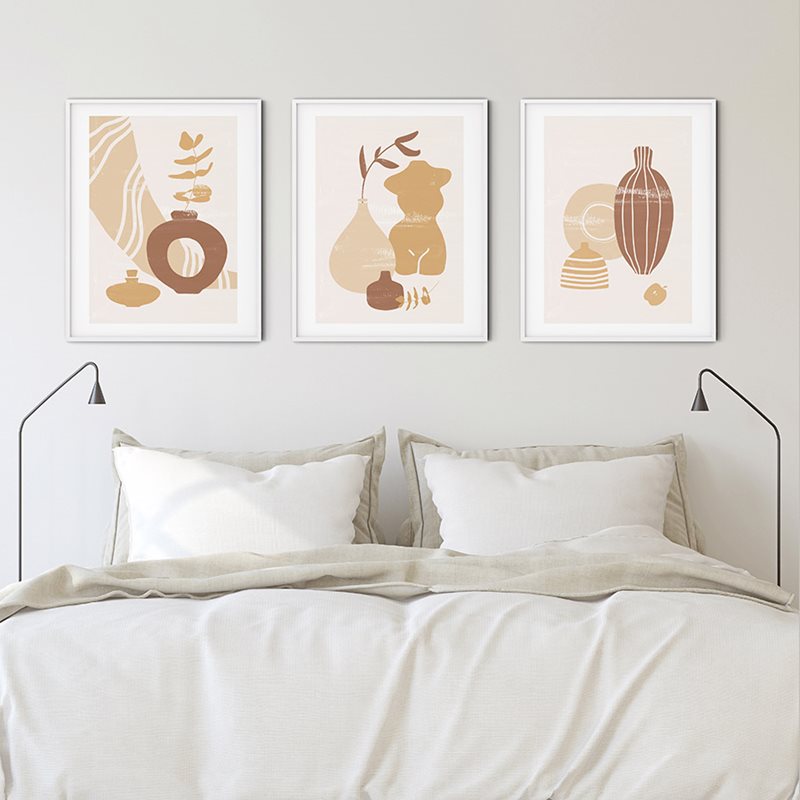 שלישיית הדפסים אמנותיים בסגנון אבסטרקטי המציגים קומפוזיציות של אגרטלים, ענפי צמחייה ופיגורת גוף נשית בגווני חום ובז’ טבעיים. הסט מוסיף לחלל תחושת חמימות, איזון ואלגנטיות, ומתאים במיוחד לסלון, חדר שינה או משרד המעוצבים בקו מודרני וסקנדינבי.