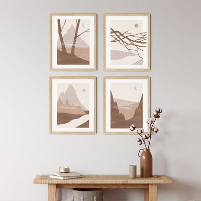 סט אמנותי של ארבעה הדפסים בהשראת נופים טבעיים – הרים, עצים, זריחות וענפים. העיצוב המינימליסטי בגווני חום ובז’ מעניק לחלל אווירה רגועה, חמימה וטבעית. מושלם לסלון, חדר שינה או משרד בעיצוב מודרני וסקנדינבי.