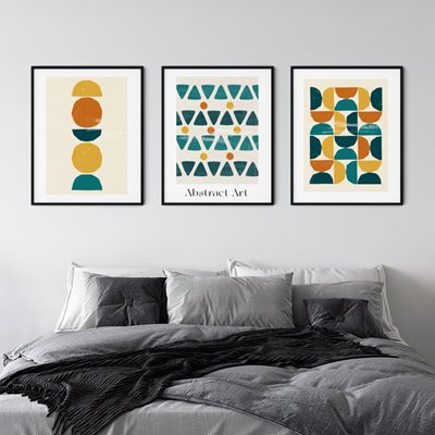 סט אמנותי של שלוש תמונות קיר אבסטרקטיות, עם שילוב של עיגולים, משולשים וחצאי עיגולים בגווני ירוק, חרדל וכתום. ההדפסים מוסיפים לכל חלל מראה מודרני, תוסס ומלא חיים, ומתאימים במיוחד לסלון, חדר עבודה או חדר שינה בעיצוב עכשווי.