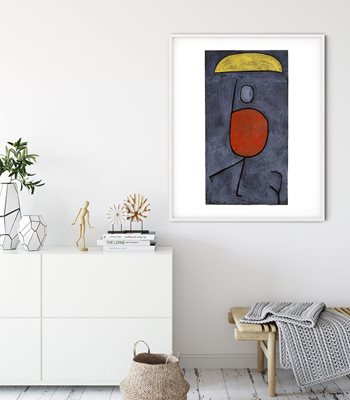הדפס אמנותי מאת Paul Klee בסגנון אבסטרקטי־מודרני, עם דמות מינימליסטית וקווים פשוטים המשלבים אדום, צהוב וכחול כהה. העבודה מציגה שילוב ייחודי בין צורה וצבע, ומוסיפה לחלל נגיעה אמנותית על־זמנית עם עומק תרבותי. מתאימה במיוחד לעיצוב סלון, משרד או חלל יצירתי.