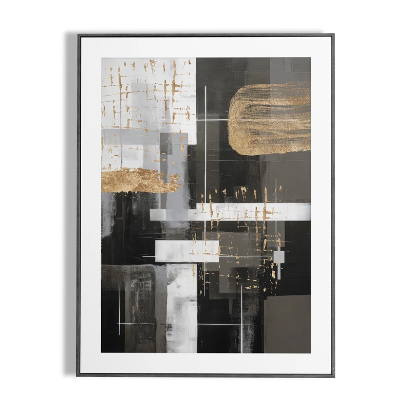 הדפס אמנותי אבסטרקטי בגווני שחור, לבן וזהב. יצירה מודרנית עם טקסטורות ייחודיות ונגיעות זהב מטאלי המעניקות מראה יוקרתי ואלגנטי. מתאימה לעיצוב סלון, חדר שינה או משרד בסגנון עכשווי ומודרני.