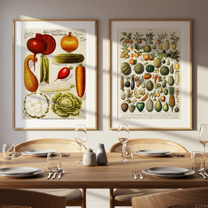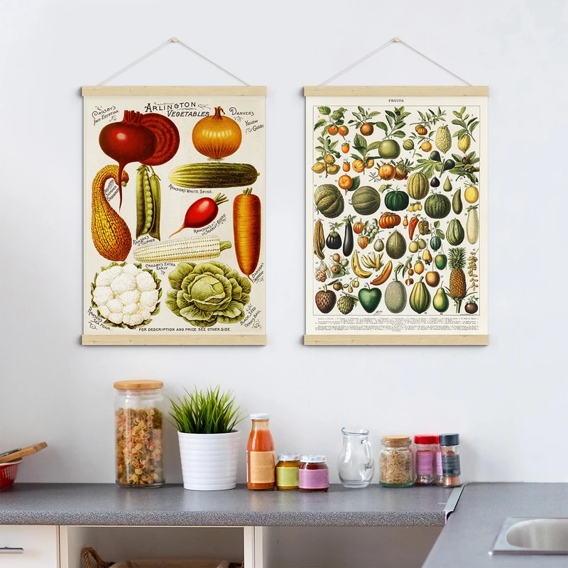 סט תמונות מטבח – איורי ירקות ופירות וינטג'