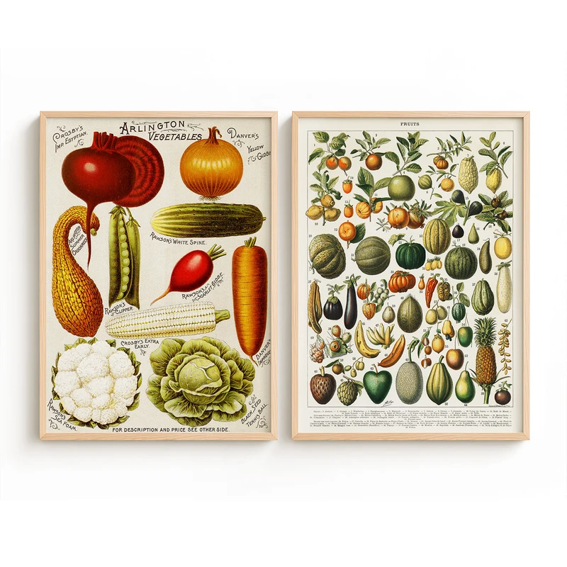 סט הדפסים וינטג' משנת 1898 המציג איורי ירקות ופירות בסגנון בוטני קלאסי. הפוסטרים הצבעוניים והעשירים בפרטים מביאים נגיעה של היסטוריה ועיצוב רטרו ייחודי לכל חלל. מושלם לעיצוב מטבח, פינת אוכל או כמתנה חובבת גינון ואמנות קלאסית.