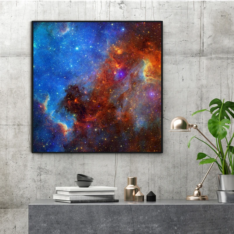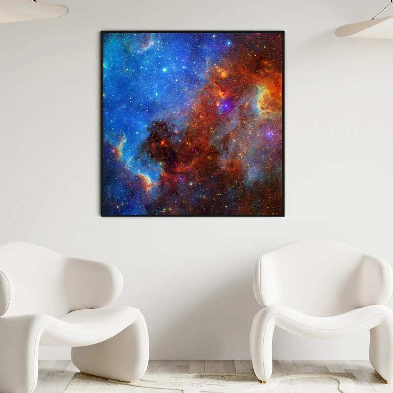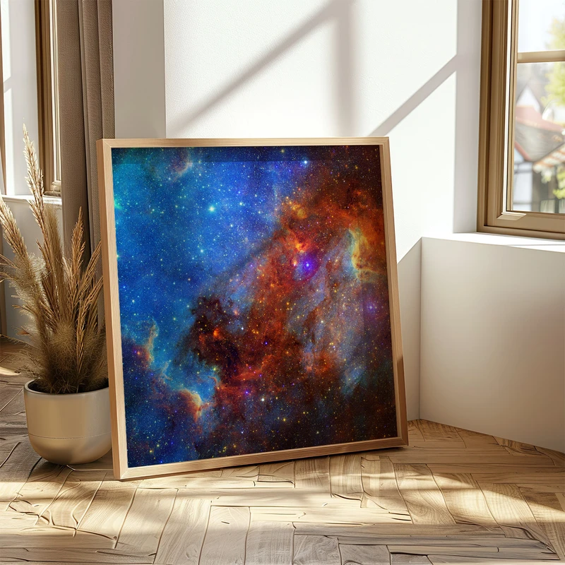 הדפס אמנותי מרהיב של ערפילית הלב (Heart Nebula – IC 1805) בקבוצת קסיופאה. צבעי הגזים האדומים והכחולים יוצרים נוף שמימי דרמטי שמזכיר ציור מופשט של הטבע הקוסמי. יצירה עוצמתית לעיצוב הבית או המשרד, המתאימה במיוחד לחובבי חלל ואסטרונומיה.