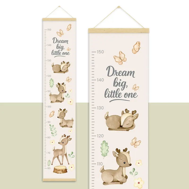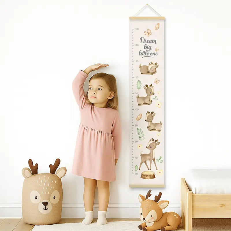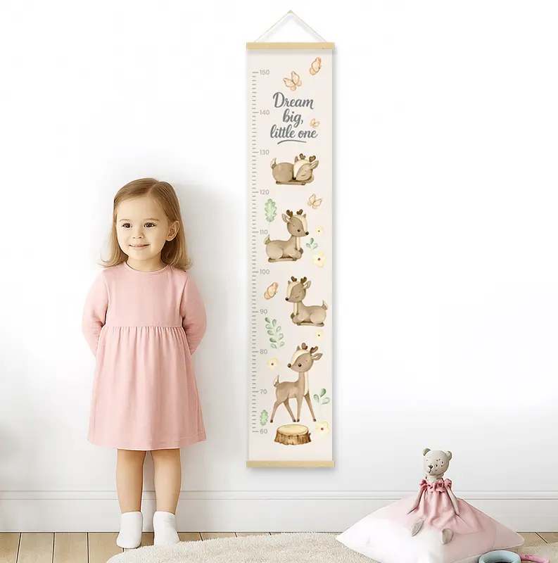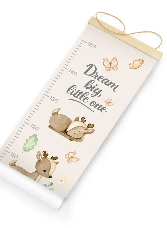 מד גובה מעוצב לילדים, מודפס על קנבס כותנה איכותי בגימור מט ומגיע עם מתלה מגנטי מעץ טבעי לתלייה נוחה ואלגנטית.