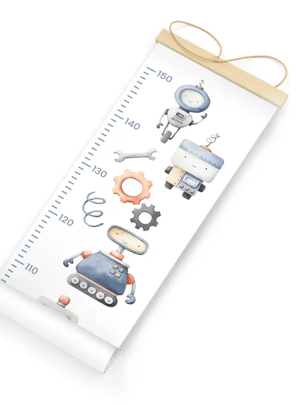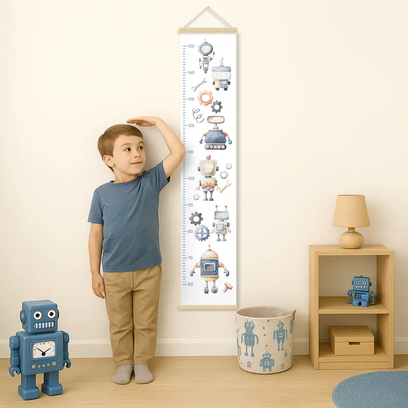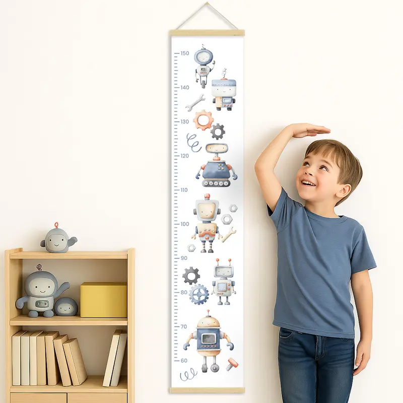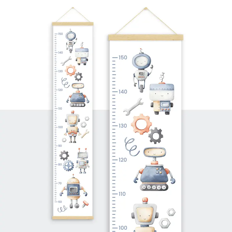 מד גובה מעוצב לילדים, מודפס על קנבס כותנה איכותי בגימור מט ומגיע עם מתלה מגנטי מעץ טבעי לתלייה נוחה ואלגנטית.