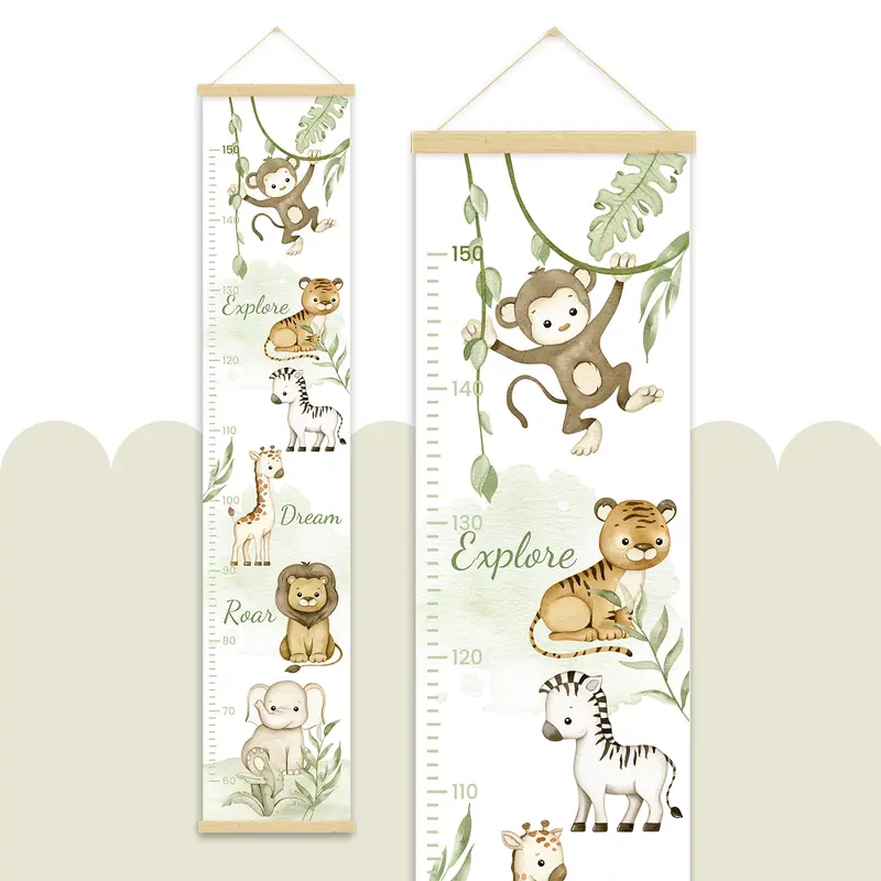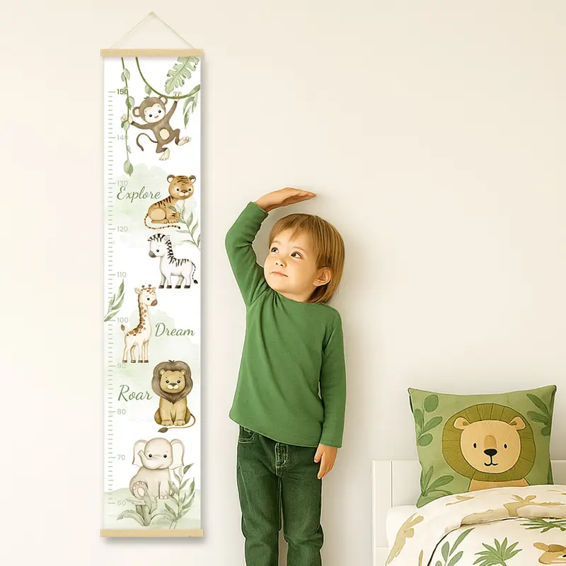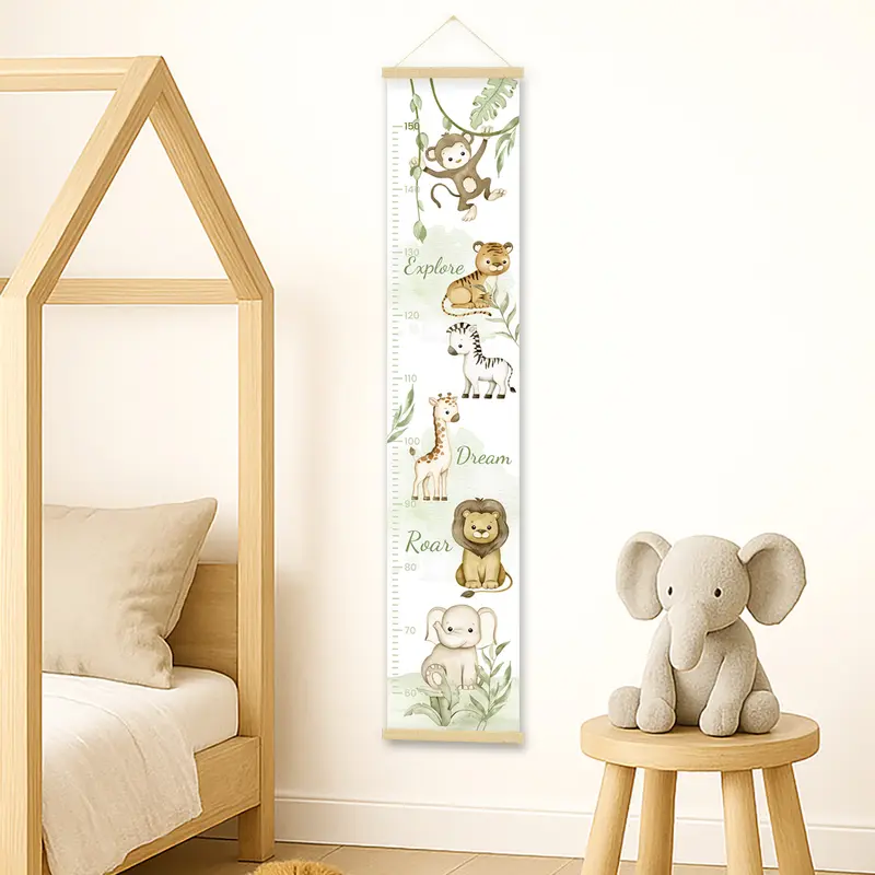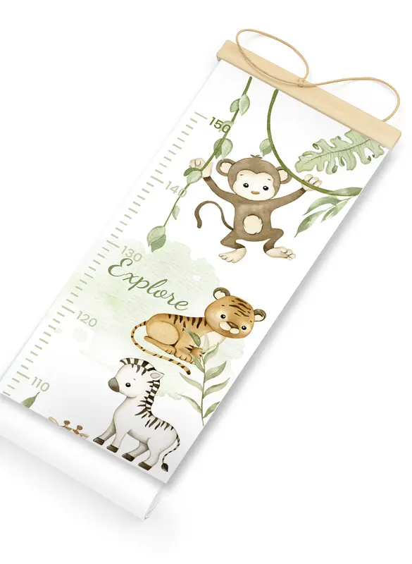 מד גובה מעוצב לילדים, מודפס על קנבס כותנה איכותי בגימור מט ומגיע עם מתלה מגנטי מעץ טבעי לתלייה נוחה ואלגנטית.