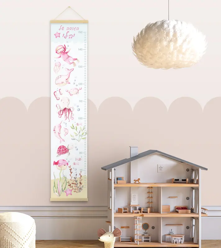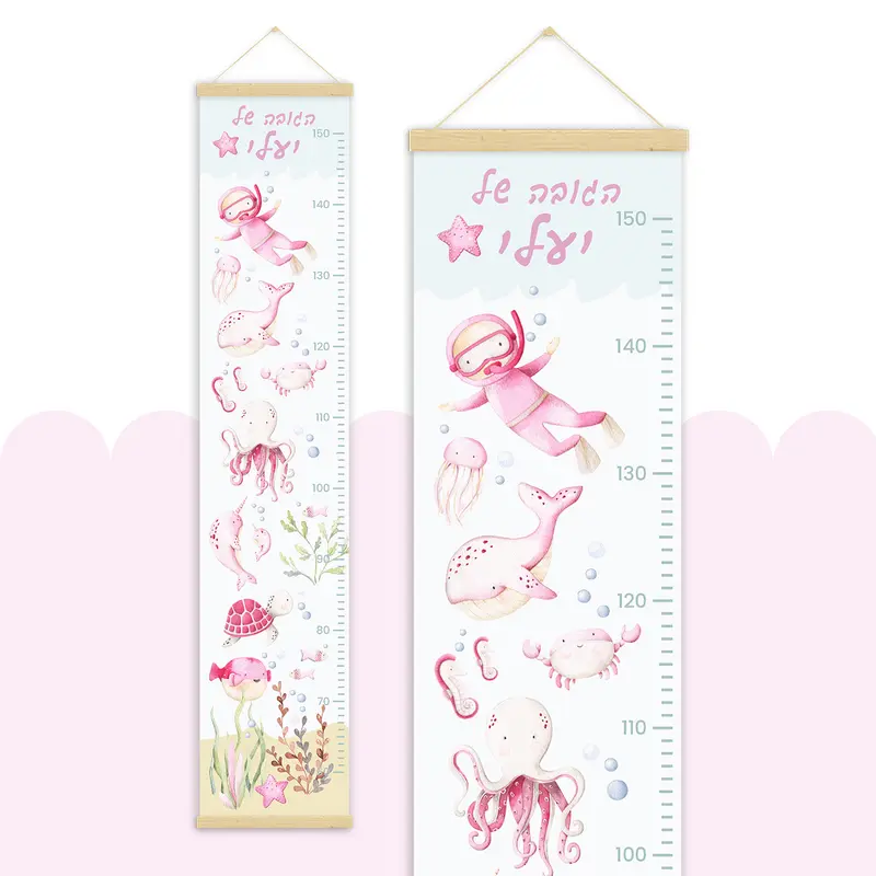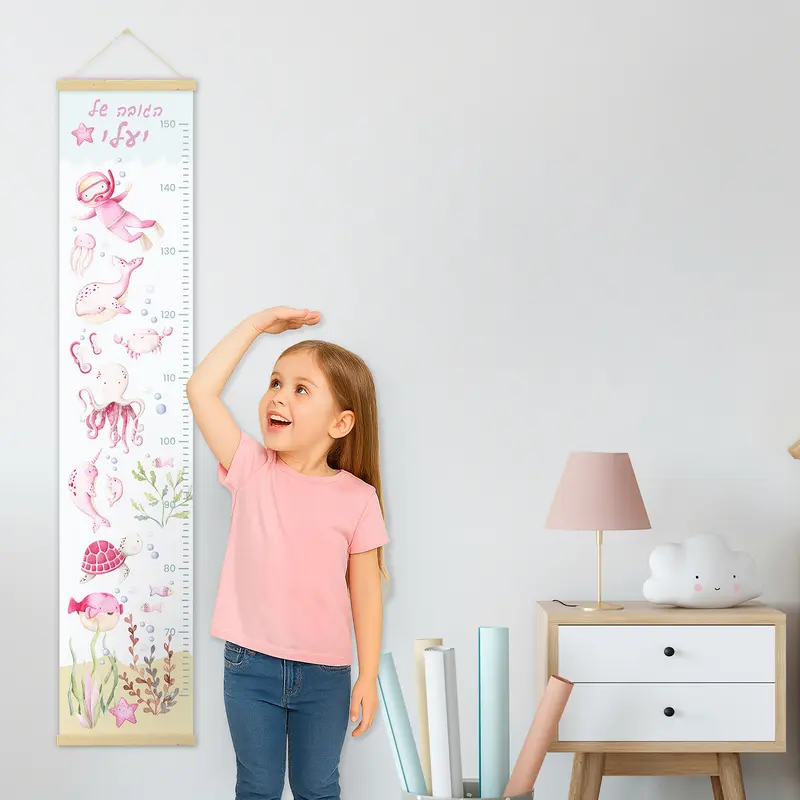 מד גובה מעוצב לילדים, מודפס על קנבס כותנה איכותי בגימור מט ומגיע עם מתלה מגנטי מעץ טבעי לתלייה נוחה ואלגנטית.