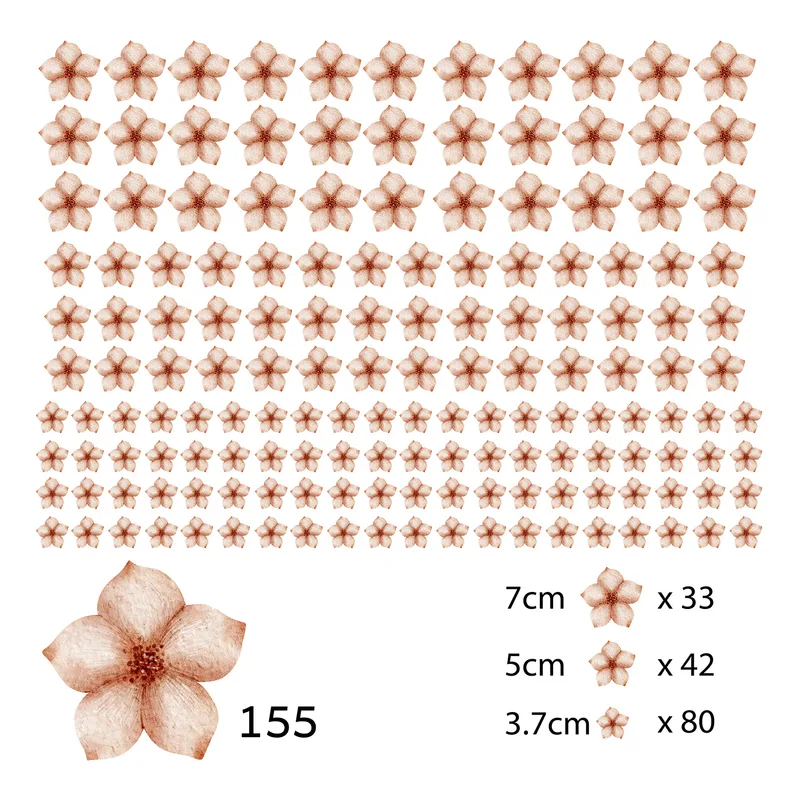 הסט כולל 155 מדבקות פרחים, גדלים בין 7 ל 3.7 ס"מ