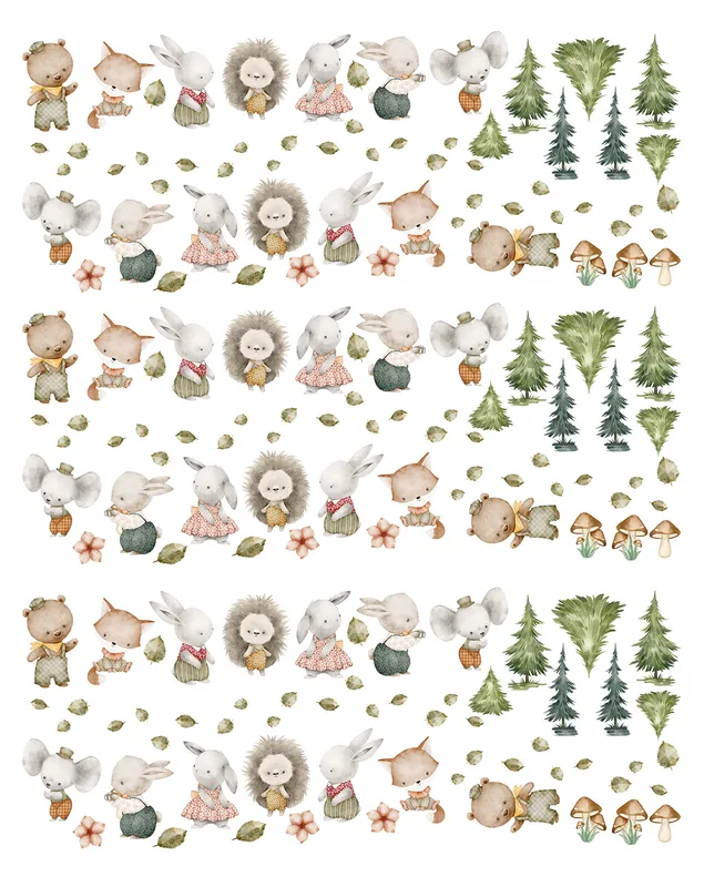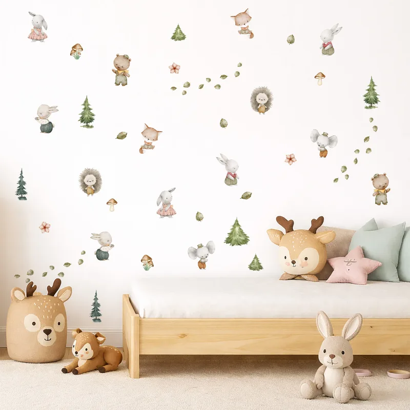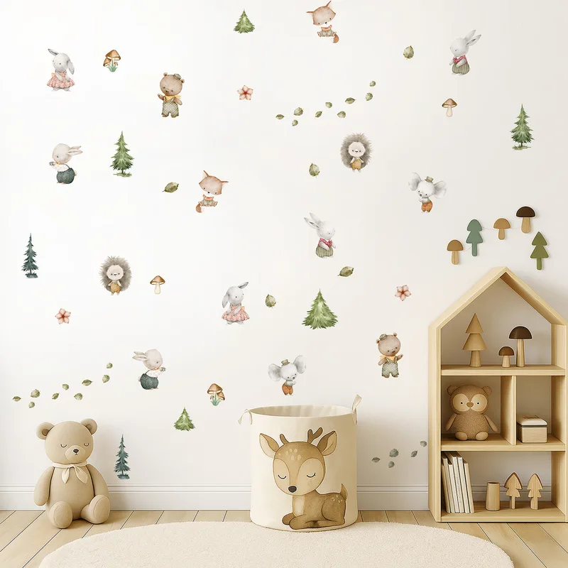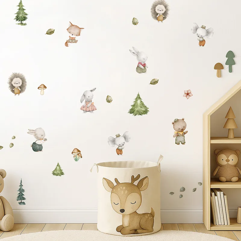 מדבקות קיר חיות יער בצבעי מים בעיצוב עדין וקסום – ארנבים, שועלים, דובים וקיפודים עם עצים, עלים ופטריות. מושלם לעיצוב חדר ילדים בסגנון טבעי, וינטג’ או סקנדינבי. מוסיף חמימות ורכות לכל קיר, נדבק בקלות ומתאים לקירות חלקים, פינות משחק וחדרי תינוקות.