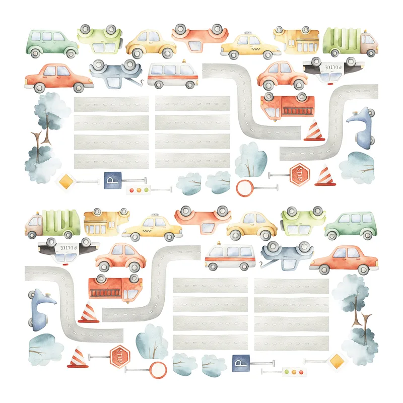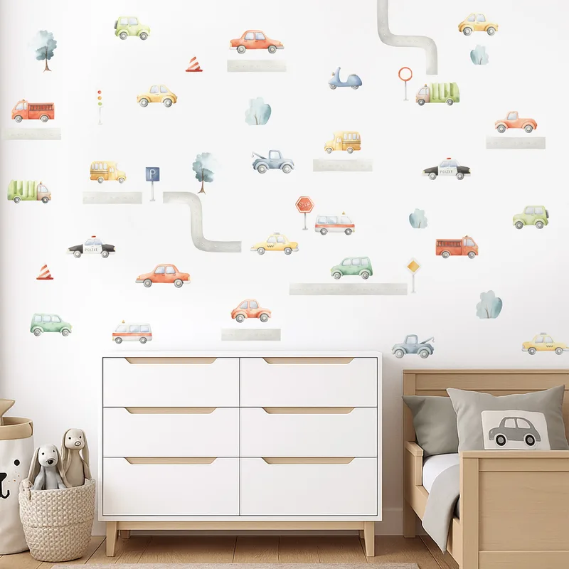 הפכו את חדר הילדים לעיר קטנה ותוססת עם מדבקות קיר מכוניות וכבישים בצבעי פסטל עדינים. כולל מכוניות, משאיות, תמרורים, עצים וכבישים – להרכבה חופשית ויצירת סצנות משחק על הקיר. מתאים לחדרי ילדים, פינות משחק וגן.