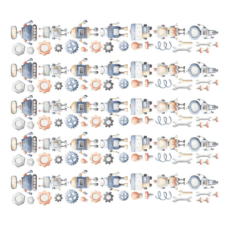 הכניסו עתיד וטכנולוגיה לחדר הילדים עם מדבקות קיר רובוטים בצבעי פסטל רכים. כולל רובוטים חמודים, גלגלי שיניים, ברגים וכלי עבודה ליצירת מראה משחקי ומעורר דמיון. מתאים במיוחד לחדרי ילדים, פינות יצירה, חדרי משחקים וגני ילדים.