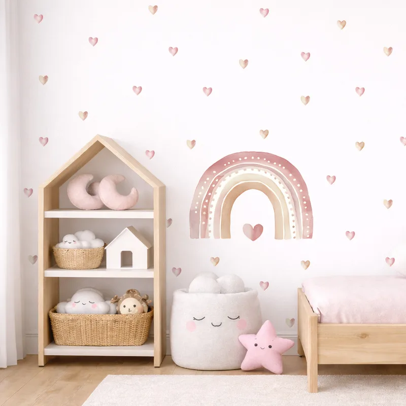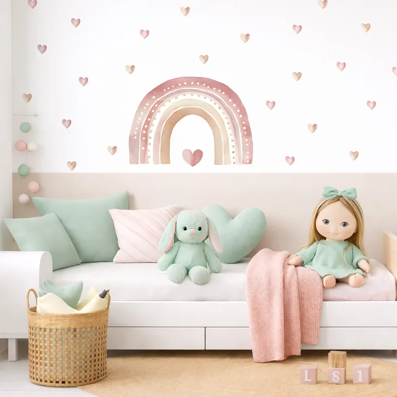 מדבקות קיר קשת בוהו ולבבות – עיצוב ניוד עדין לחדר ילדים