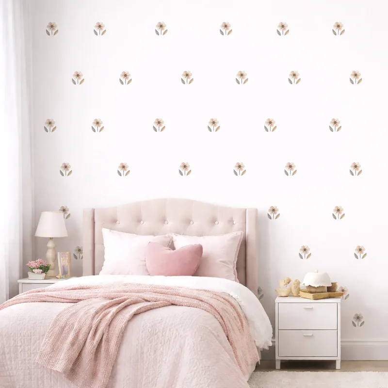 סט מדבקות קיר פרחים עדינים בגווני ורוד פסטל, היוצר מראה נקי ומעוצב בכל חדר. אידיאלי לחדר ילדות, נוער או שינה – הדבקה קלה, עמידות גבוהה ופיזור חופשי לקבלת קיר פרחוני חלומי תוך דקות.