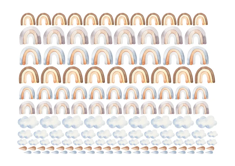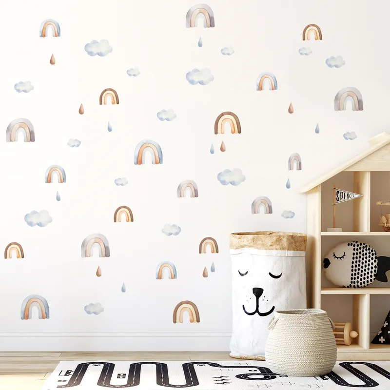 מדבקות קיר קשתות, עננים וטיפות בגווני פסטל רכים שמוסיפות אווירה רגועה ומתוקה לחדר הילדים. קלות להדבקה ולהסרה, ללא פגיעה בקיר, ומתאימות לסידור חופשי לפי הדמיון. דרך מושלמת לעיצוב מהיר של חדר תינוקות, ילדים או פינת משחקים.