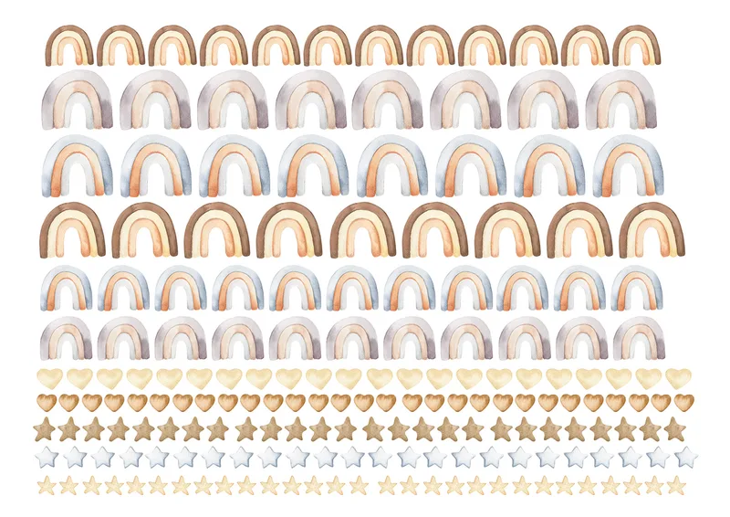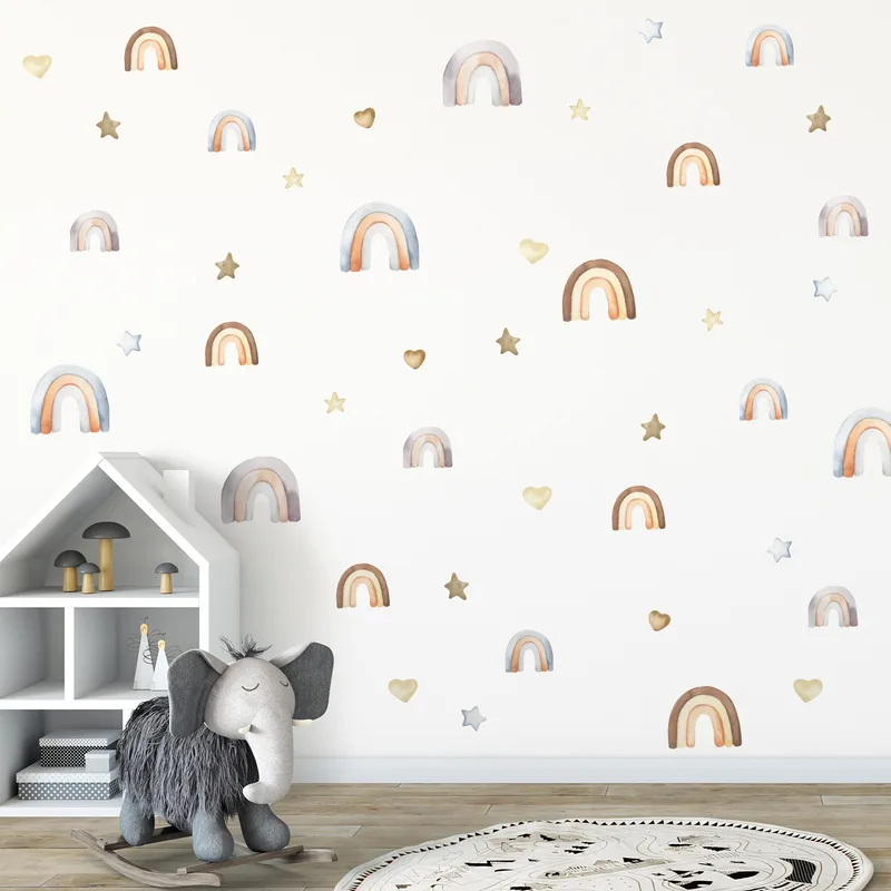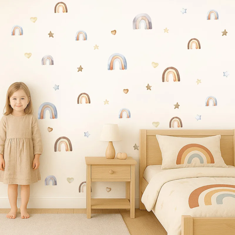 מדבקות קיר בצבעי מים עדינים של קשתות, כוכבים ולבבות, מוסיפות לחדר הילדים מראה בוהו רך ומזמין. הסט מתאים לכל סגנון ריהוט, משתלב נהדר עם צבעים טבעיים ויוצר אווירה רגועה ונעימה. קל להדבקה ולהסרה, מושלם לחדר שינה, משחקים או פינת יצירה.