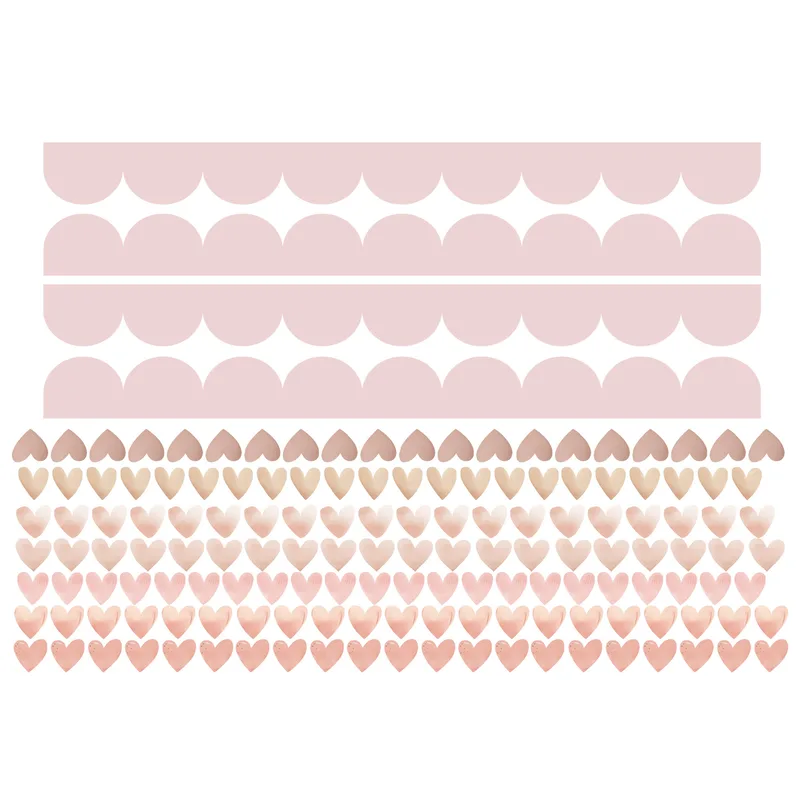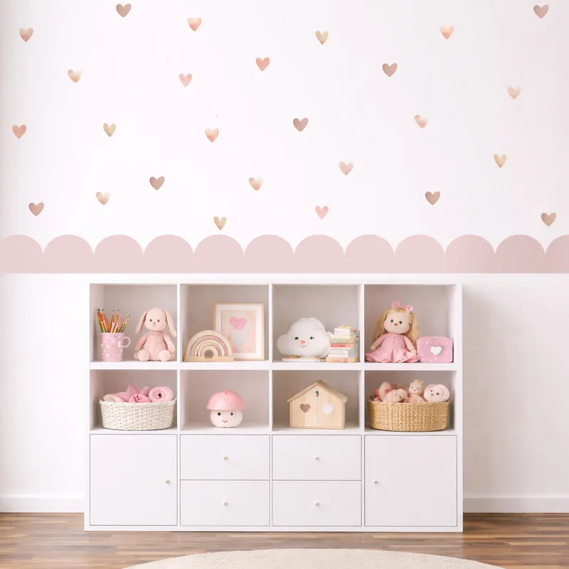 סט משולב כולל בורדר גלי בצבע ורוד רך ומדבקות לבבות תואמות לפיזור על הקיר.