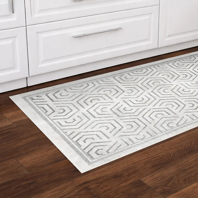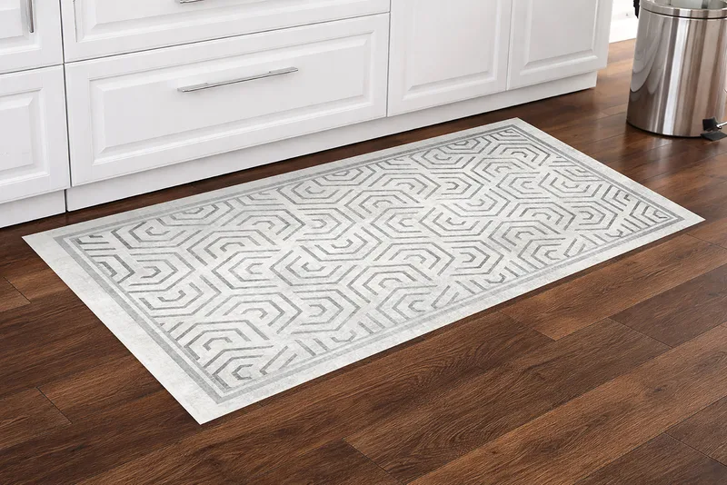 שטיח פי וי סי למטבח בעיצוב קווים גיאומטריים בגווני אפור בהיר