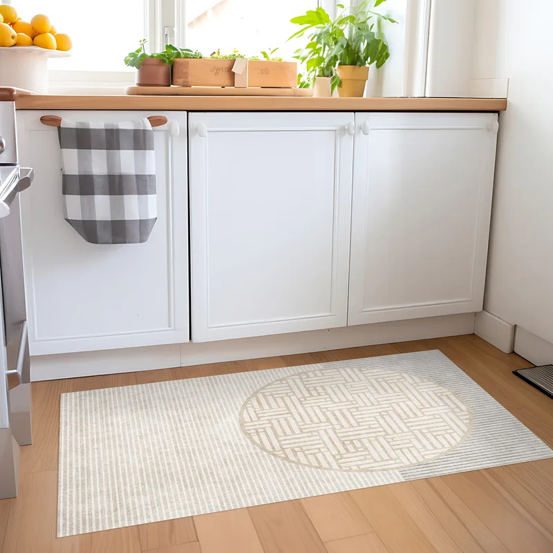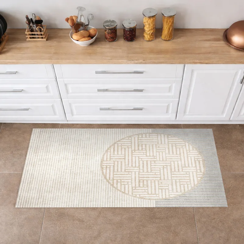 שטיח פי וי סי למטבח בעיצוב סקנדינבי בהיר עם דוגמת עיגול