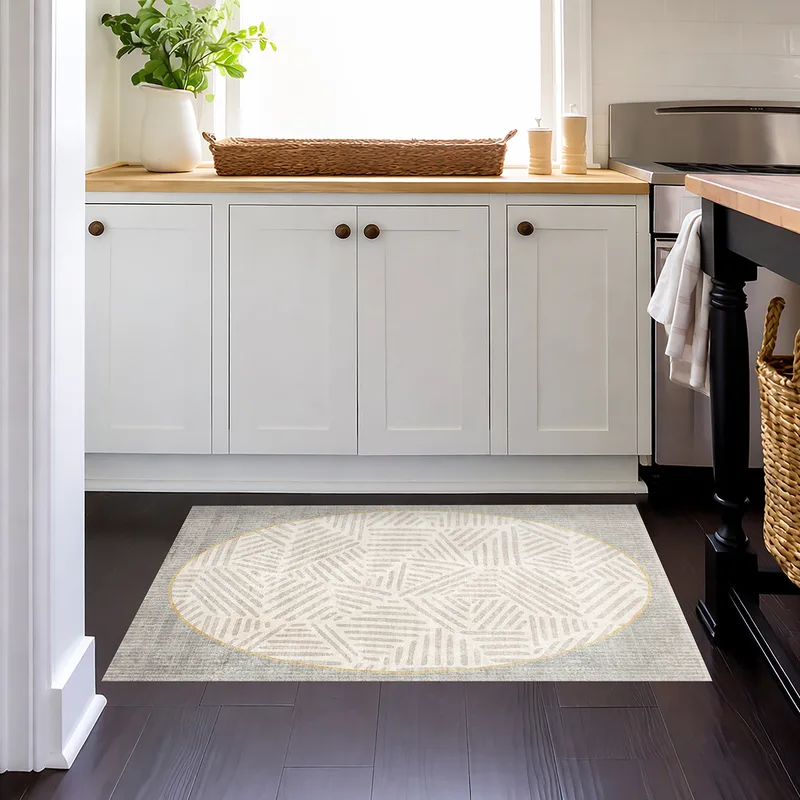 שטיח למטבח פי וי סי PVC בעיצוב בוהו שיק בגווני קרם ואפור