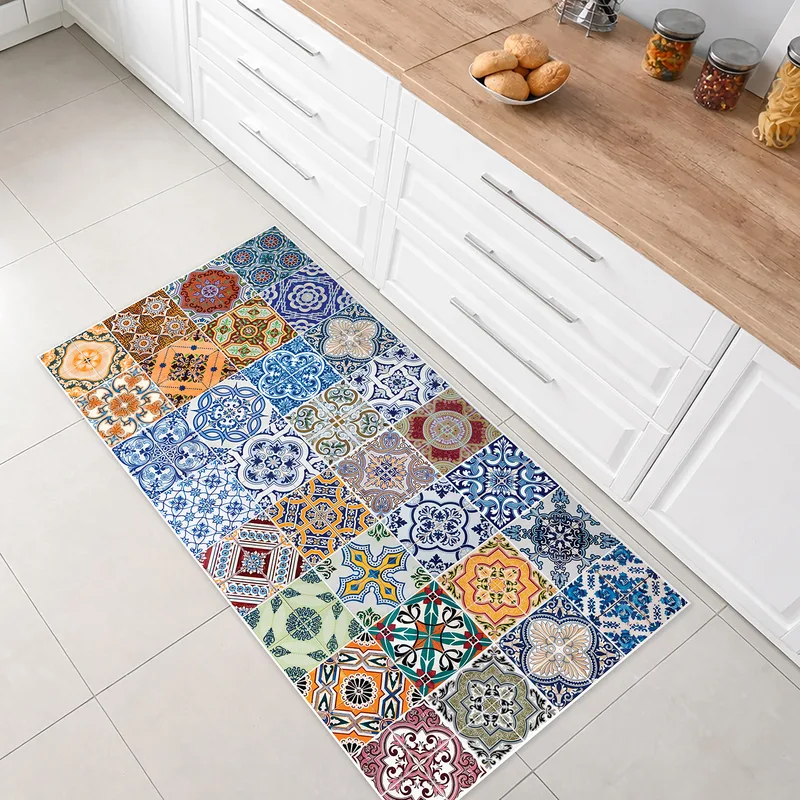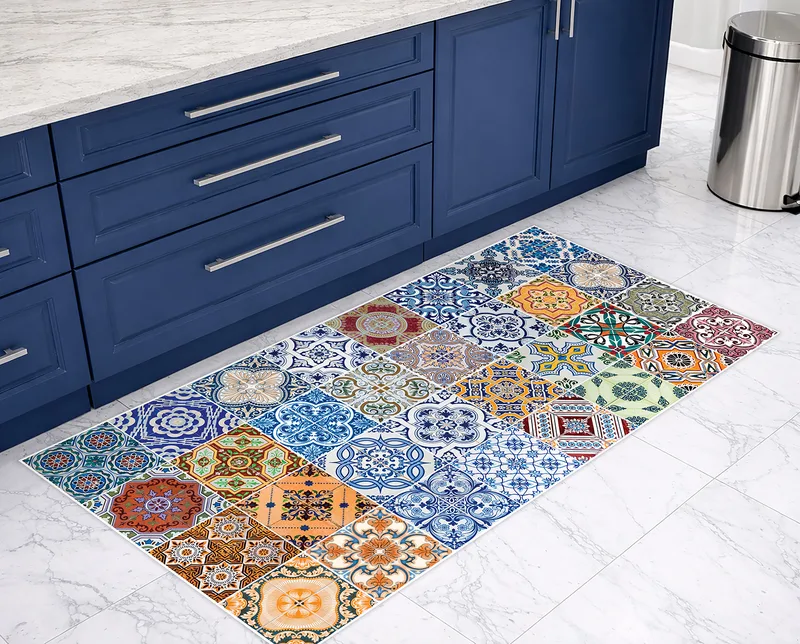 שטיח למטבח פי וי סי בעיצוב פסיפס מרוקאי בגווני כחול וכתום