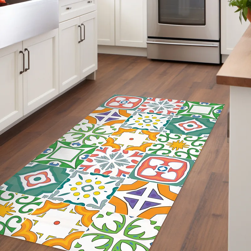 שטיח פי וי סי למטבח דוגמת פסיפס ספרדי בגווני ירוק כתום וכחול