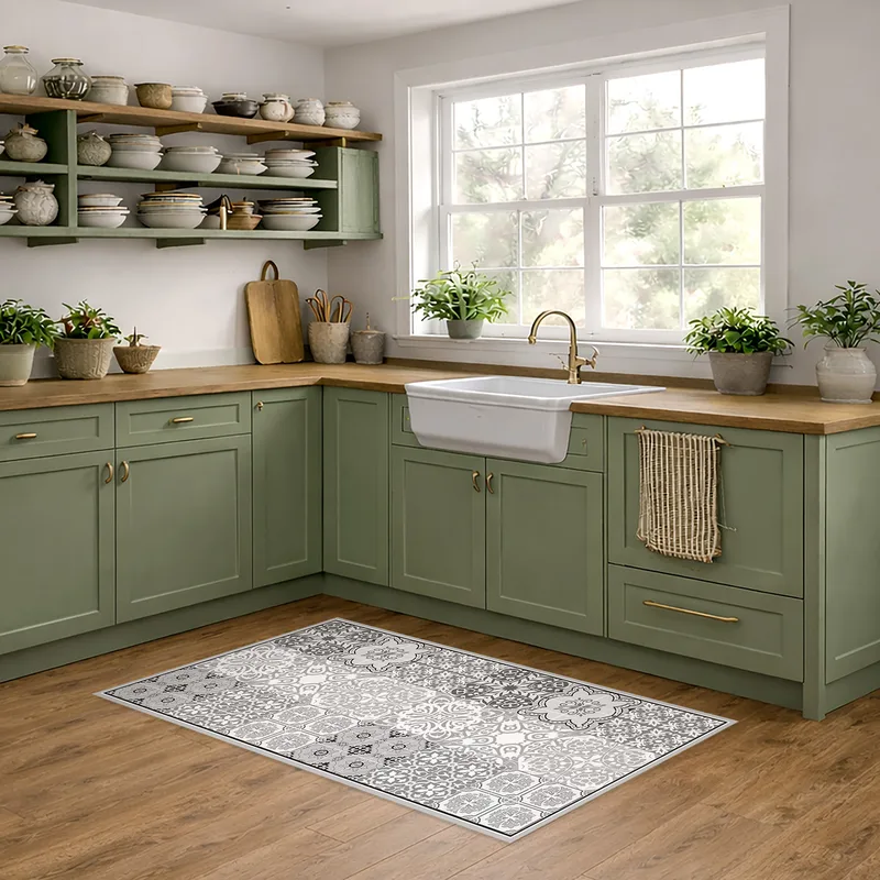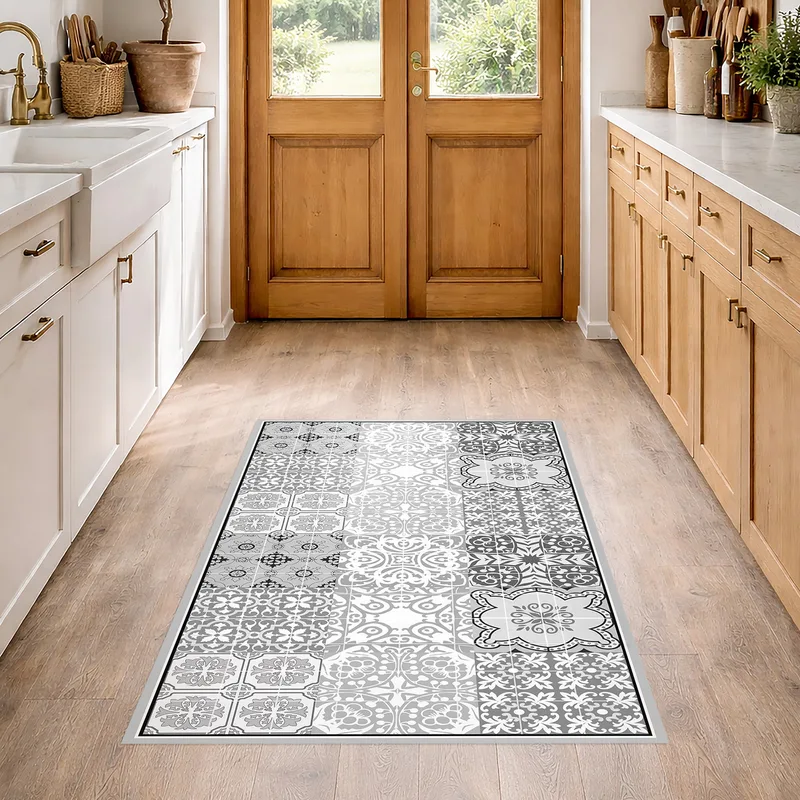 שטיח פי וי סי למטבח בעיצוב אריחים מרוקאים שחור לבן אפור