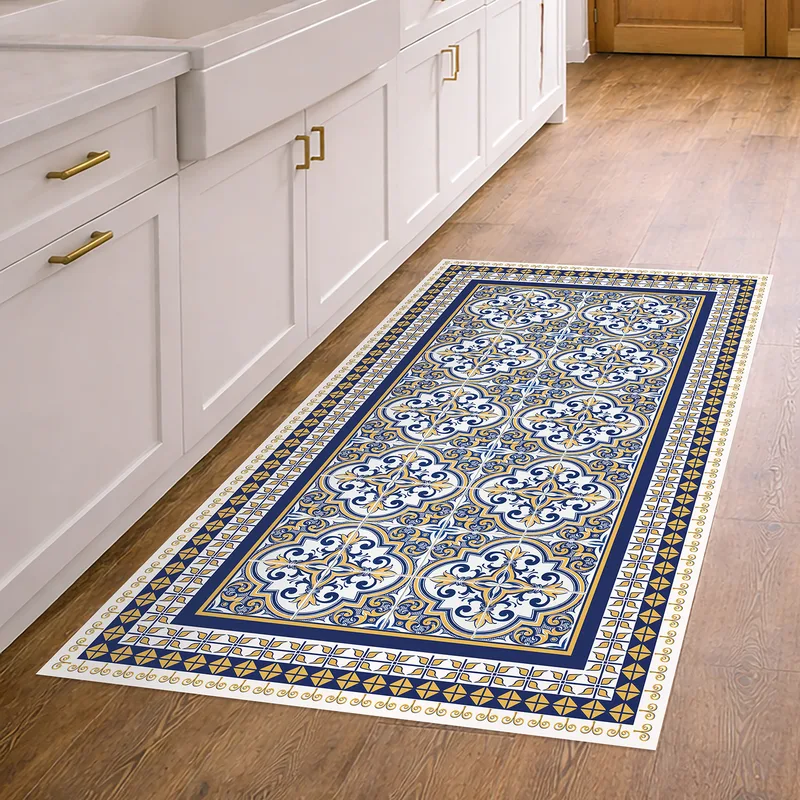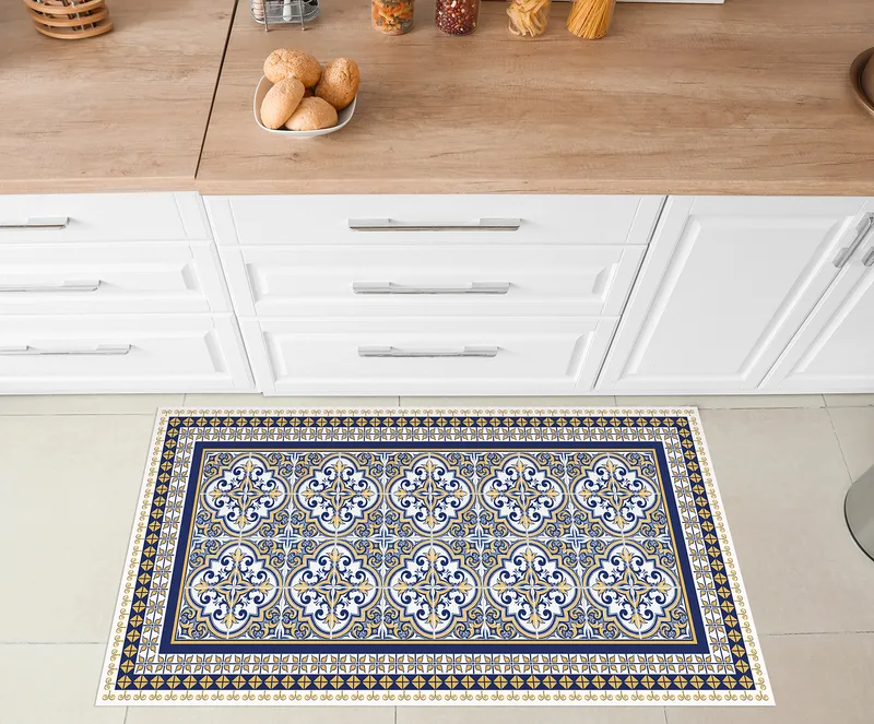 שטיח פי וי סי למטבח דוגמת פסיפס אזולז’ו כחול עם מסגרת דקורטיבית