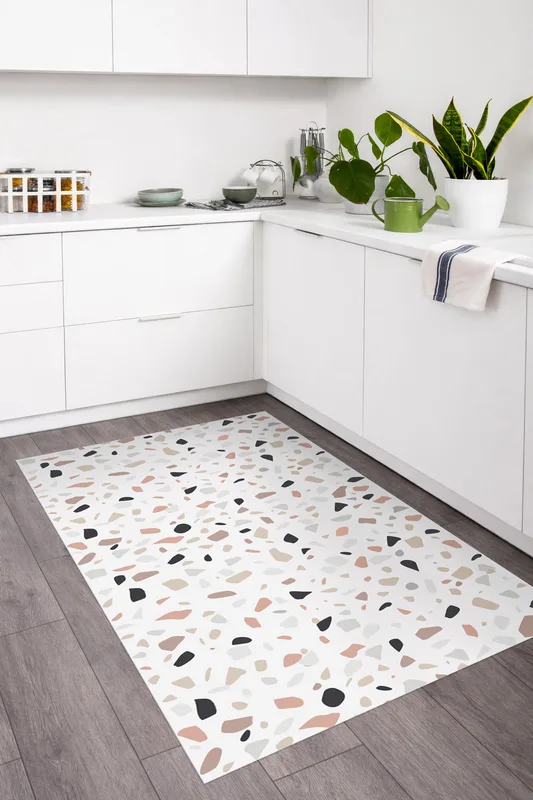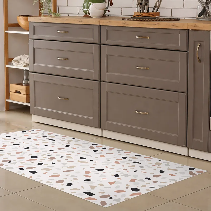 שטיח פי וי סי למטבח בעיצוב טרצו נקי בגווני אדמה רכים