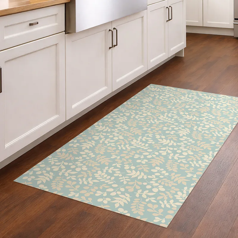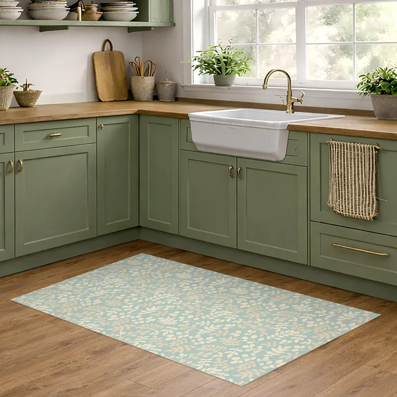 שטיח PVC למטבח בעיצוב עלים פסטל בגוון מנטה עדין