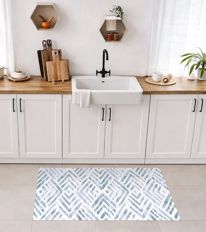 שטיח פי וי סי מעוצב למטבח בסגנון זיגזג כחול