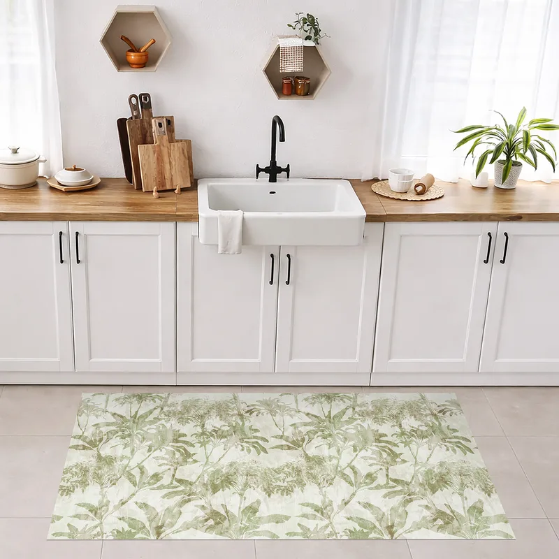 שטיח פי וי סי למטבח בעיצוב עלים טרופיים ירוקים טבעיים