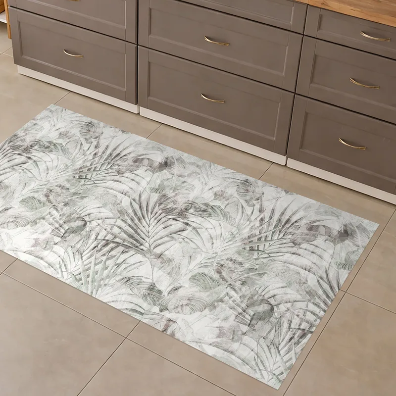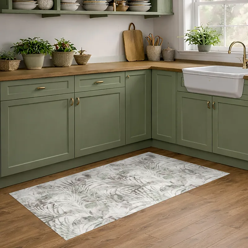שטיח פי וי סי למטבח בעיצוב עלים טרופיים בגוונים טבעיים