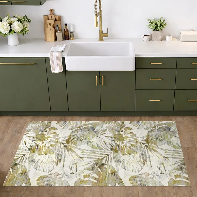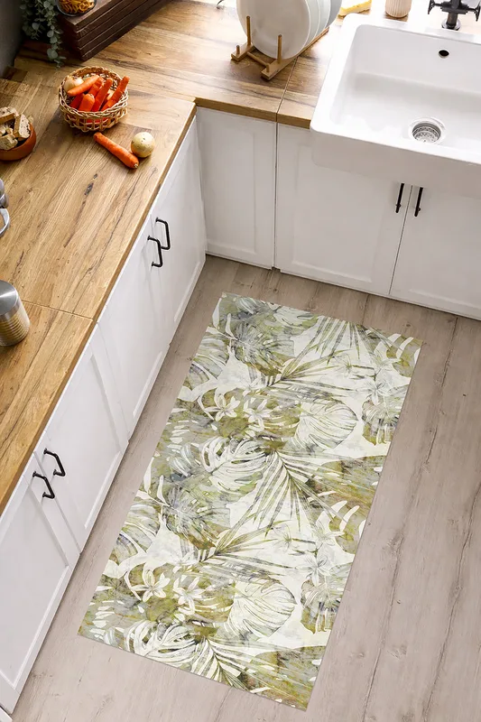 שטיח PVC מעוצב למטבח דוגמת עלי דקל ופרחים טרופיים