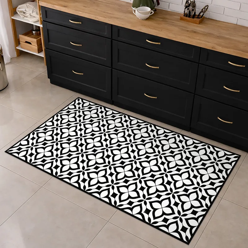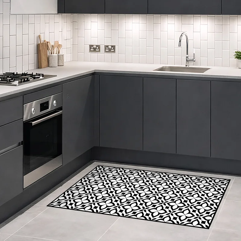 שטיח פי וי סי למטבח מראה אריחים דקורטיביים שחור לבן